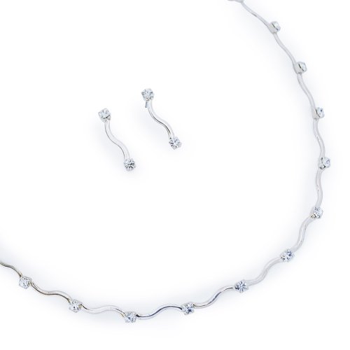 Ideally suited as a bridesmaid gift, our Contemporary Rhinestones Jewelry Set is both beautiful and affordable. Each sterling silver curved bar on the necklace and earrings duo is capped with a single Swarovski crystal rhinestone creating a bridal jewelry set that is simply stunning. The sterling silver-plated and crystal necklace has a dainty curve while the matching earrings hang from pierced posts. Perfect for your wedding day and beyond, this jewelry set has a timeless look that will be worn for years to come. Set includes pierced earrings and a matching necklace. Details: Size: Necklace measures 16 inches long. Earrings measure 3/4" long Materials: Sterling silver plated with Swarovski crystal rhinestones and then update cheapest prices immediately. Limited time Only!
